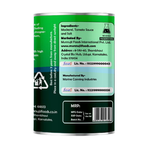 Munnujii Canned Mackerel in Tomato Sauce 155g Savour the Authentic Taste of Karnataka Experience the rich and authentic flavours of Karnataka with Munnujii Canned Mackerel in Tomato Sauce. Each 155g can is a delightful blend of high-quality mackerel, sourced locally from the pristine waters off the Karnataka coast, and expertly cooked in a rich, flavourful tomato sauce. Our commitment to freshness and quality ensures that you enjoy the best in every bite.