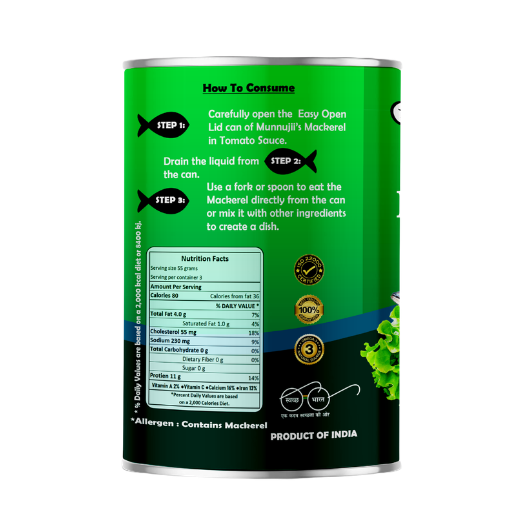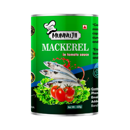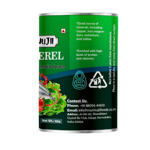 Munnujii Canned Mackerel in Tomato Sauce 425g savour the Authentic Taste of Karnataka. Experience the rich and authentic flavours of Karnataka with Munnujii Canned Mackerel in Tomato Sauce. Each 425g can is a delightful blend of high-quality mackerel, sourced locally from the pristine waters off the Karnataka coast, and expertly cooked in a rich, flavourful tomato sauce. Our commitment to freshness and quality ensures that you enjoy the best in every bite.