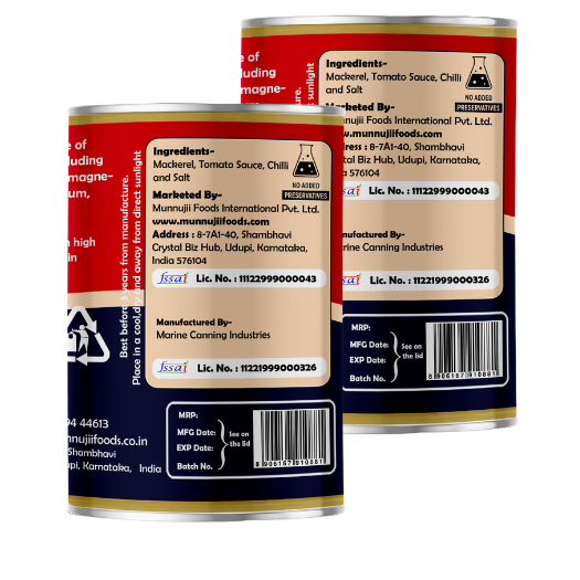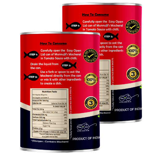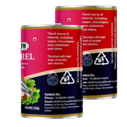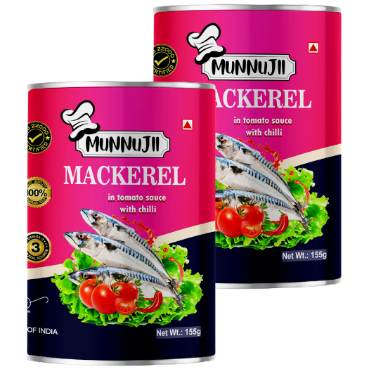 Munnujii canned Mackerel in tomato sauce and chili. Packed with premium-quality Mackerel, the rich tomato sauce adds a tangy zest, while the chili spice adds a delightful kick. Indulge in this delectable fusion, perfect for adding a burst of flavour to your meals.