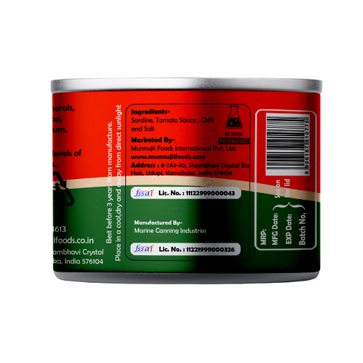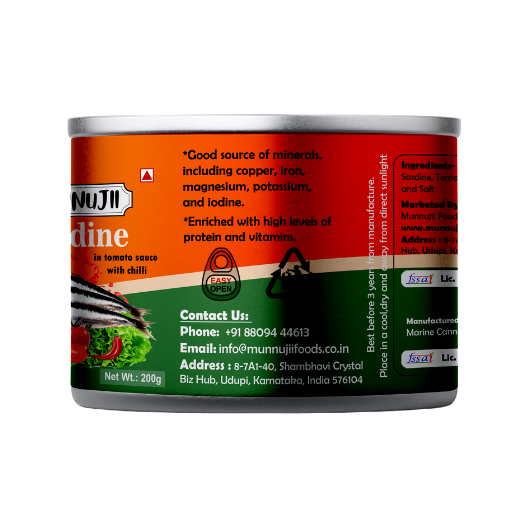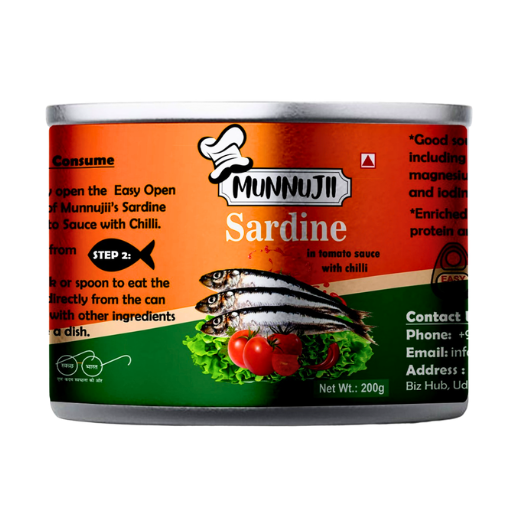 Munnujii Canned Sardine in Tomato Sauce & Chilli 200g is a perfect blend of rich taste and nutrition, combining premium-quality sardines with tangy tomato sauce and a spicy chili twist. Packed with protein, Omega-3 fatty acids, calcium, and essential vitamins, this ready-to-eat canned fish supports a healthy lifestyle while satisfying your taste buds. With zero preservatives, an easy-open can, and a long shelf life, it offers both convenience and freshness. Enjoy it straight from the can or add it to rice, bread, pasta, or Indian curries for a delicious and protein-rich meal. Munnujii brings you one of the best spicy sardines in tomato sauce in India, making healthy eating simple, flavourful, and exciting.