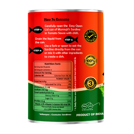 • NUTRITIONAL VALUE: A powerhouse of nutrition, Munnujii Canned Sardine in Tomato Sauce & Chilli is rich in lean protein (approx. 10g per serving) and Omega-3 fatty acids, along with Vitamin D, Calcium, and Iron to support heart, bone, and overall health.