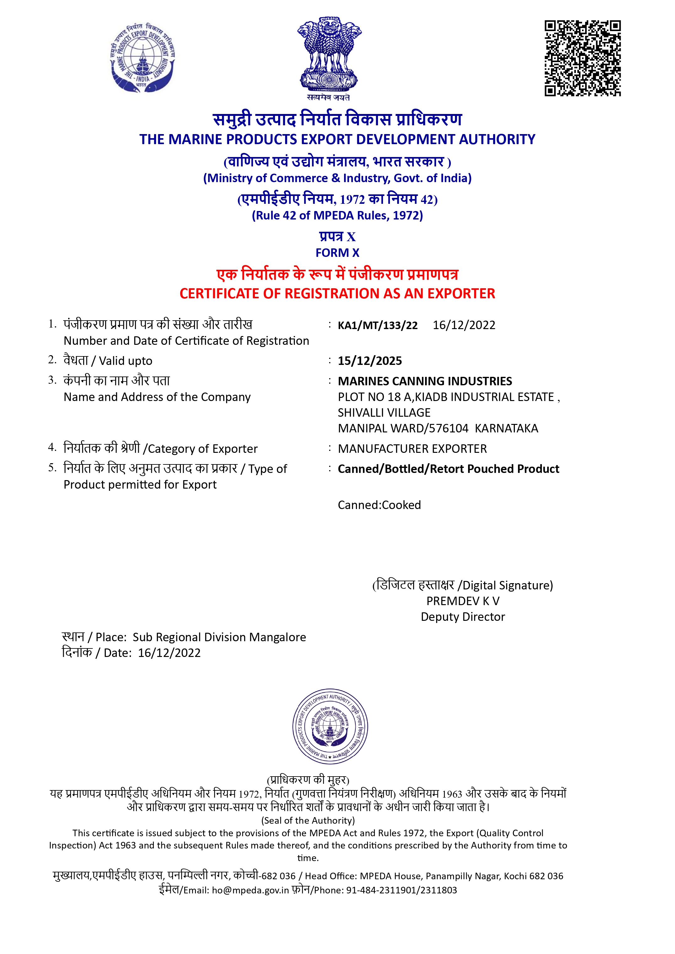 Marines Canning is a trusted seafood manufacturing company committed to delivering safe, nutritious and high-quality canned fish from the Indian seas to homes around the world. Located along the coastal region of Karnataka, we work closely with local fishermen to source the freshest catch every day. Our state-of-the-art processing facility follows strict hygiene standards, advanced sterilization technology, and globally recognized food safety practices to ensure that every can meets the highest quality benchmarks.