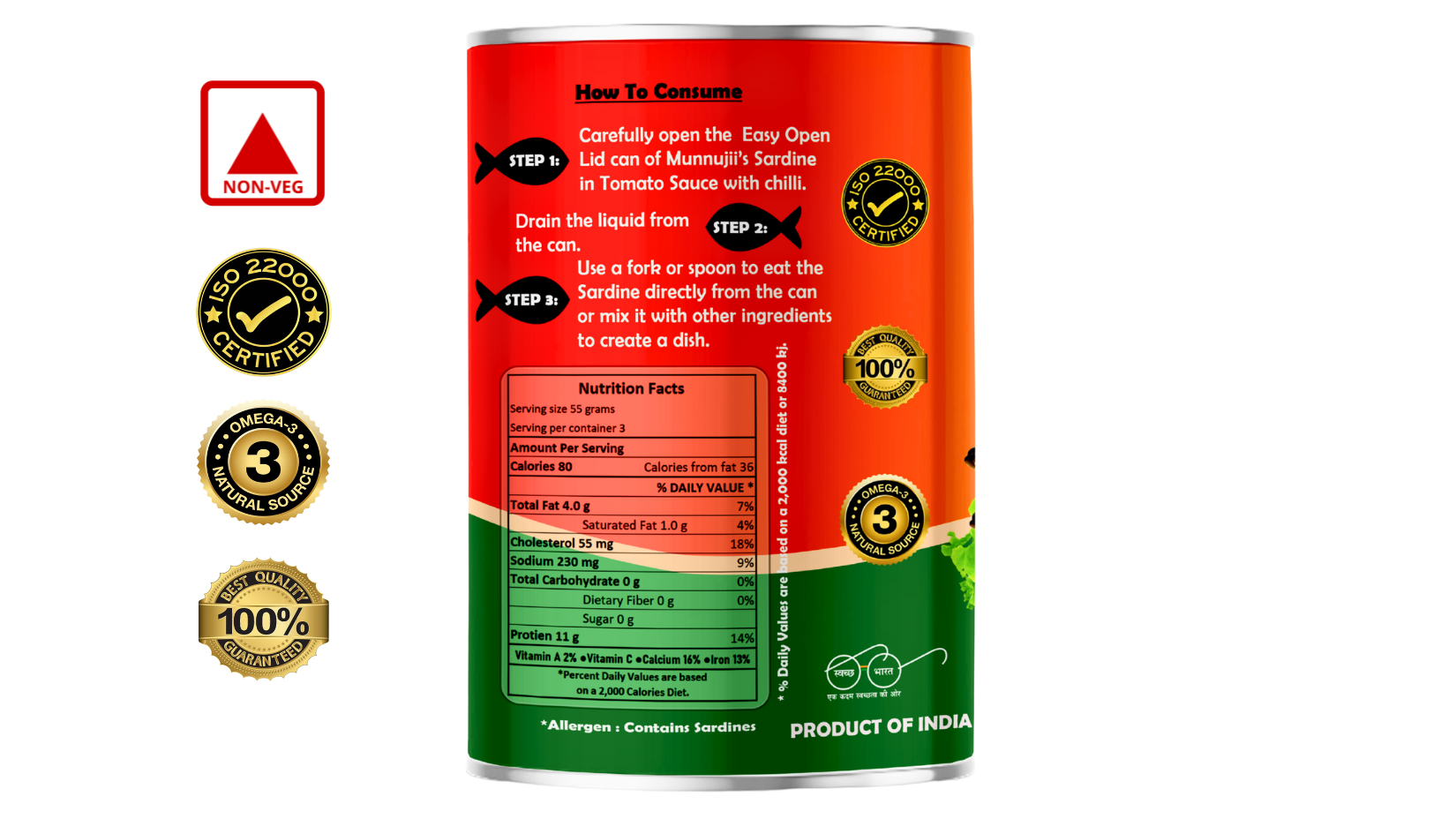 • NUTRITIONAL VALUE: A powerhouse of nutrition, Munnujii Canned Sardine in Tomato Sauce & Chilli is rich in lean protein (approx. 10g per serving) and Omega-3 fatty acids, along with Vitamin D, Calcium, and Iron to support heart, bone, and overall health.